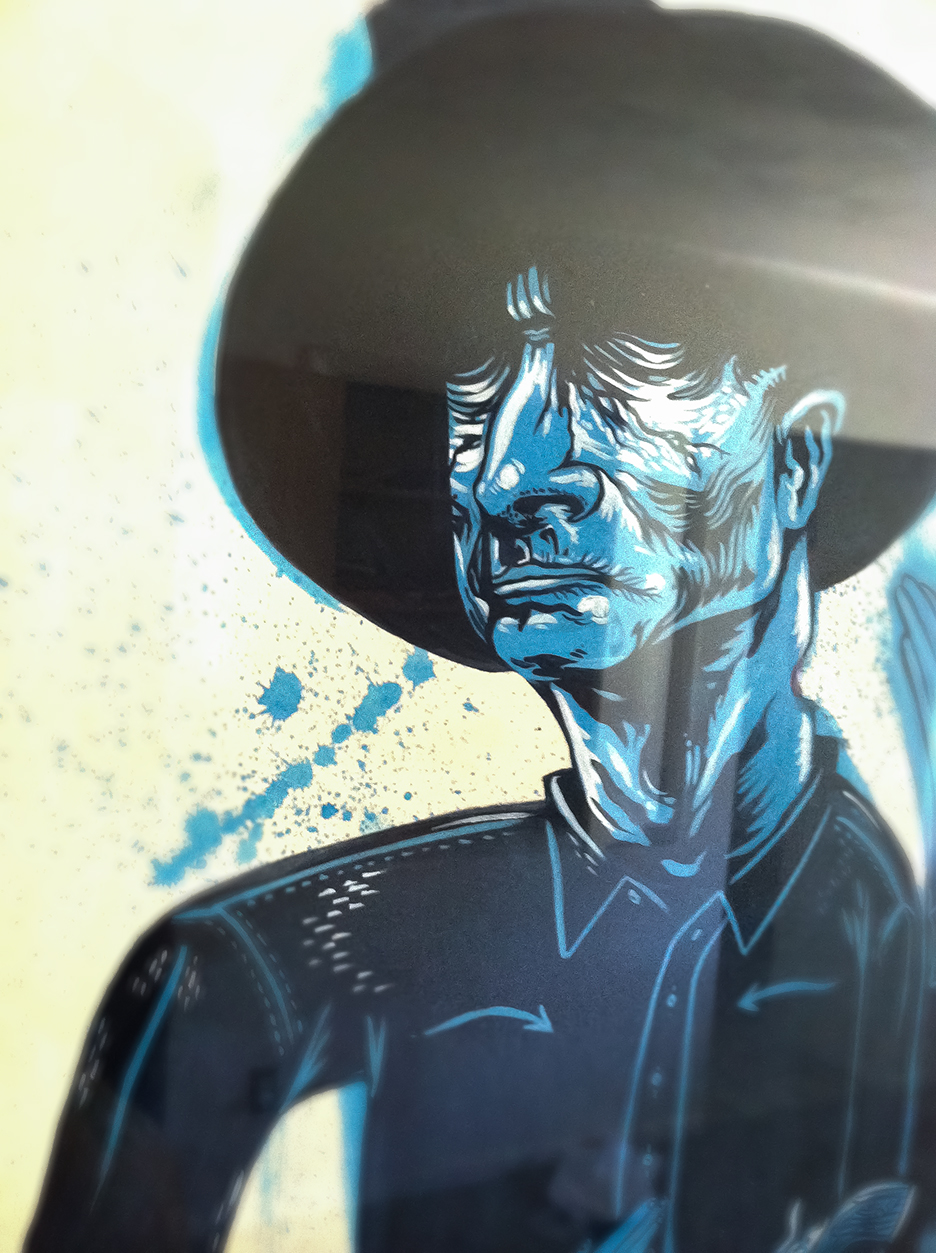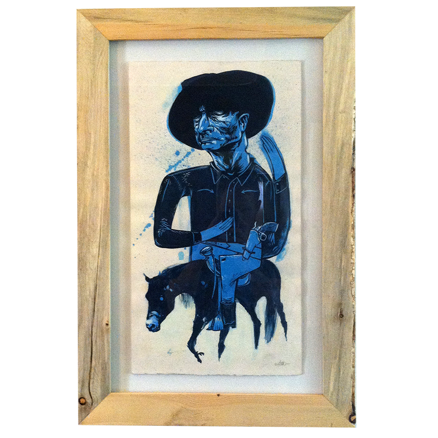 Original gouache and acrylic painting on cotton rag paper of the cowboy form the Lucero death in west themed tour in 2011.